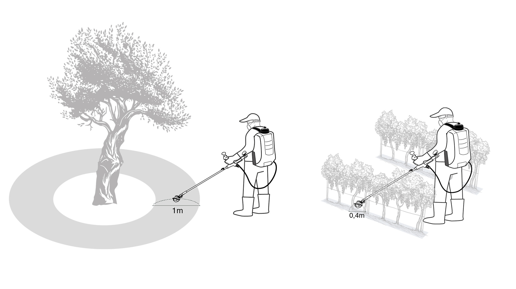 • Disco pequeño: Entre hileras (Viñas, hortalizas…)–Huella de 0,4 m Ø y gotas de 700 micras: máxima precisión cerca del tallo. Para mayor control y seguridad, se recomienda el uso de la campana protectora.